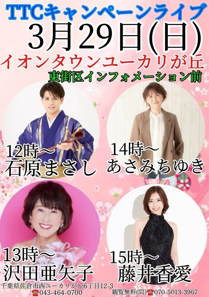 【キャンペーン】イオンタウンユーカリが丘 SCHEDULE 2026/03/29(日) 15:00 - イオンタウンユーカリが丘東街区インフォメーション前 地図を表示 千葉県佐倉市西ユーカリが丘6丁目12-3 イオンタウンユーカリが丘ホームページペー URLをコピーする 報告する